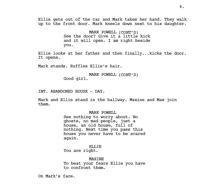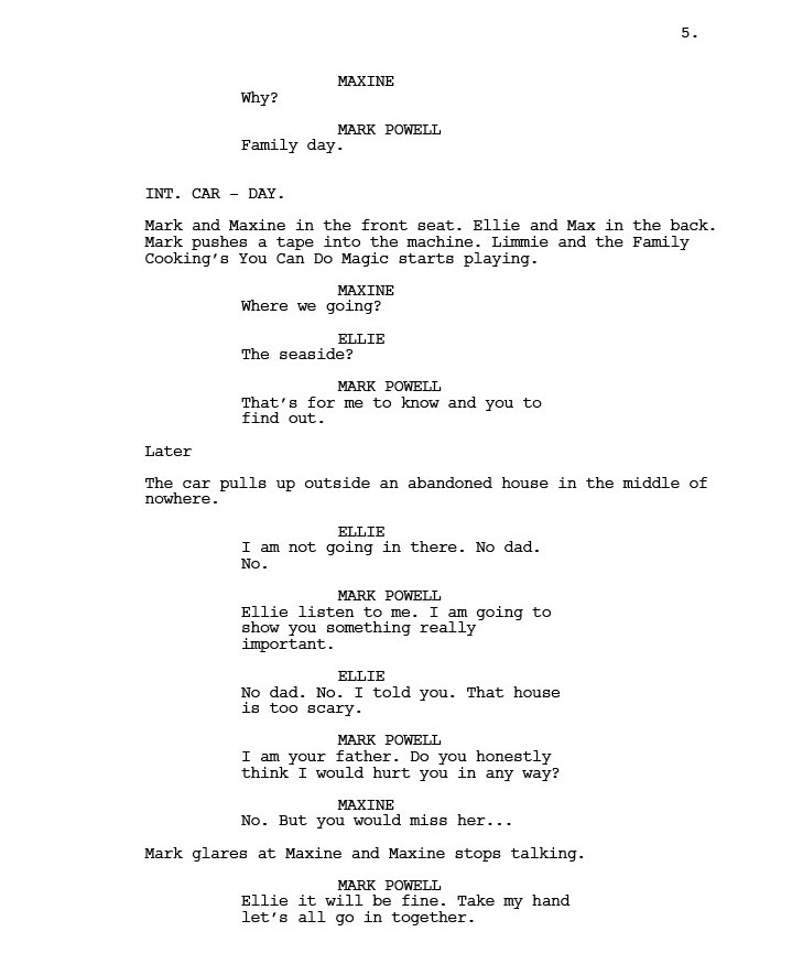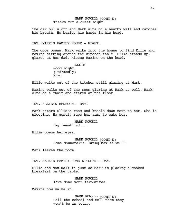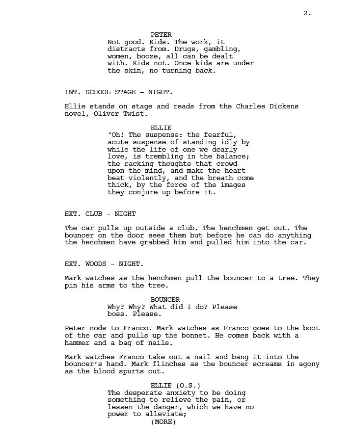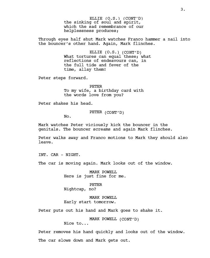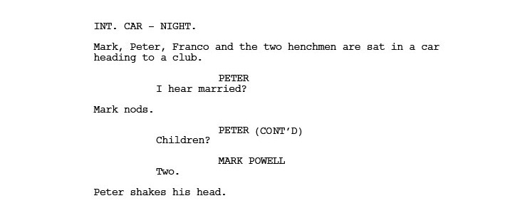 However, by his own admission, Mark got too close to the flame and was badly bitten by his associates. Which is what the film is about. In this extract from the script, Mark is being taken to meet Franco’s boss Peter on the night his daughter Ellie is performing for her school play, an event Mark has faithfully promised his family he will attend. The phrase O/S net to sone of Ellie’s dialogue means Off Screen.